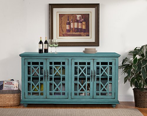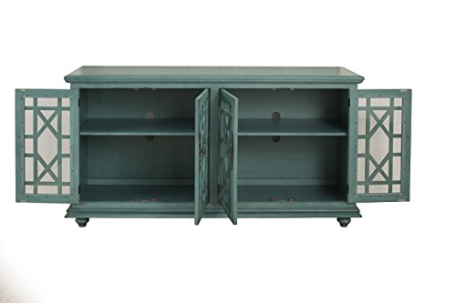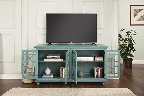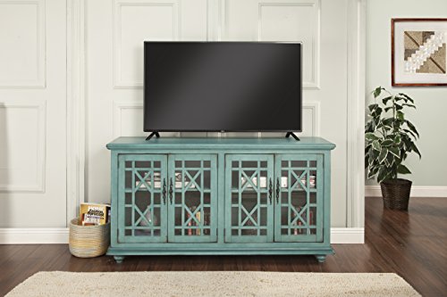 The jules TV stand features a beautiful Teal finish with sophisticated transitional styling inspired by design cues taken from Parisian antique markets. Elegant trellis details on the glass doors, intricately cast door pulls, turned bun feet, and architectural moldings are all blended together for an exquisite look. Each piece is slightly distressed with just the right amount of rub through at the edges to make it seem like this was a piece handed down through generations. The versatile design allows the piece to be used as an Entertainment console, an Entry hall credenza, or as a dining room server. Removable and adjustable shelves provide versatile storage options for audio, video, Gaming components. Vertical wire management cutouts allow for easy access with multiple shelf configurations. Ideal for 65” flat panel TVs. Eta (easy to assemble). anti-tip kit added for safety. Assembled Dimensions: 63" W x 35" h x 18" d. Materials: MDF, glass.Feature