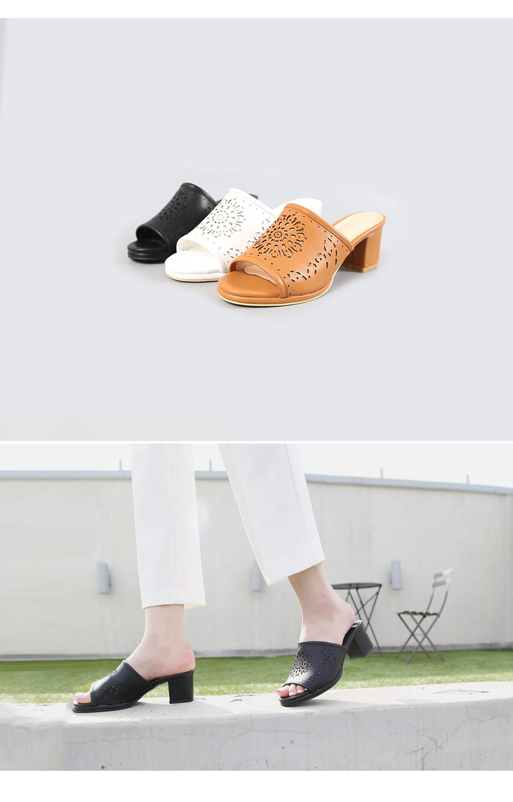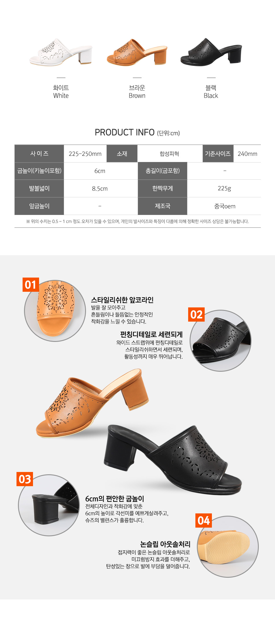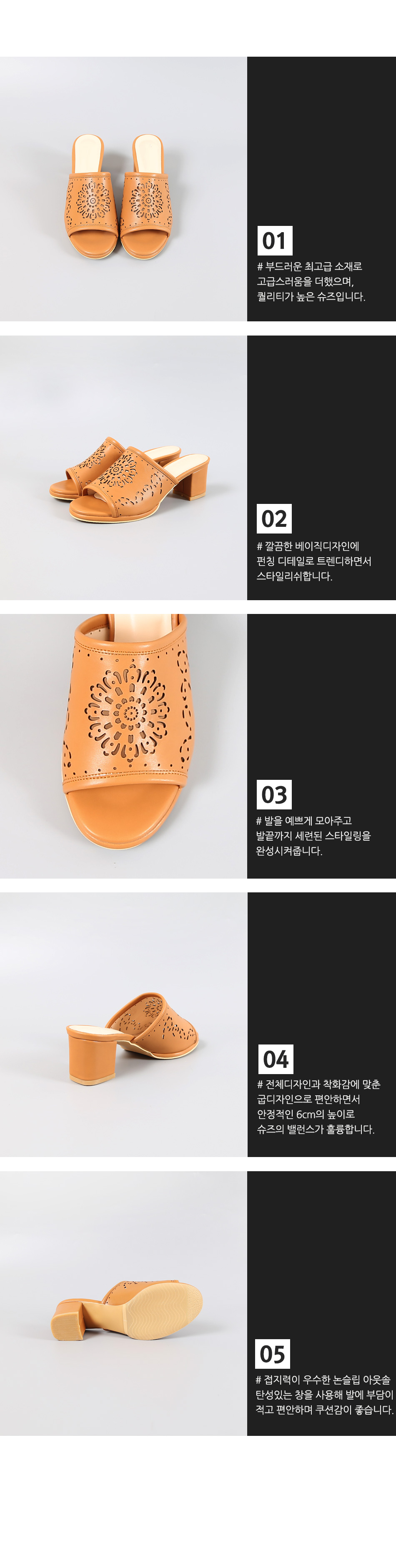 TJ1046. 카엘노[MD COMMENT]깔끔한 베이직디자인이지만트렌디한 무드가 느껴지는 슬리퍼 소개해드릴게요.와이드 스트랩위에 펀칭디테일로 스타일리쉬한 요녀석은6cm 어찌보면 높은 굽이지만 도톰한청키힐로 장시간착화에도 부담없어요.사무실슬리퍼로는 물론 실외에서도 예쁘게 착화되는 녀석이라하나쯤 소장하시면 매일 꺼내신게 되실거라 생각해요 =D