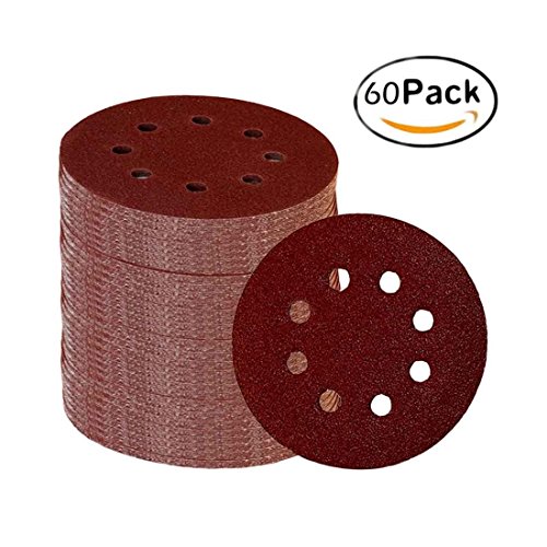 Fadetech 60 Pieces 8 Holes 5 Inch Sanding Discs Hook and Loop 40/80/120/180/240/320 Grit Sandpaper Assortment for Random Orbital Sander