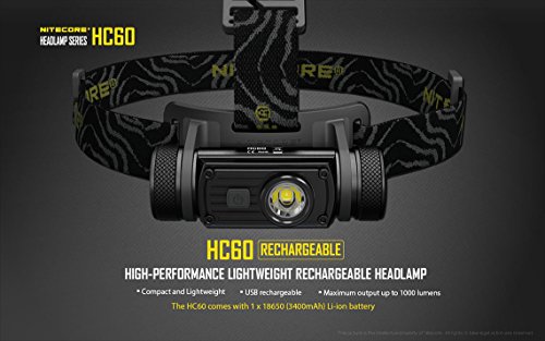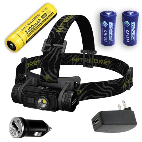 Nitecore HC60 Rechargeable LED Headlamp 1000 Lumens with Eco-Sensa Premium Lithium CR123A batteries & Car & Wall Adapter