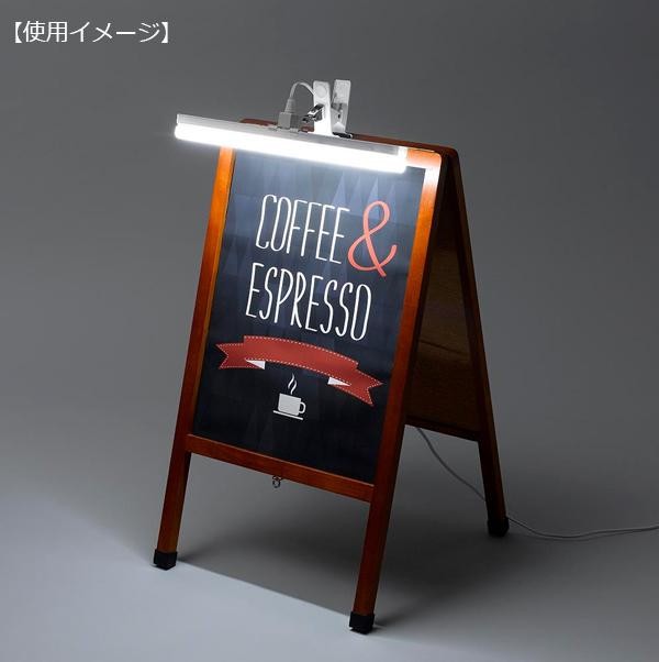 | 広く明るく照らせる、イーゼル看板に適したクリップライト。アームとクリップの接続部は回転するので、ヘッドの向きを変えることができます。LED一体型の照明器具なので、ランプの購入や取り替えの手間がありません。 |