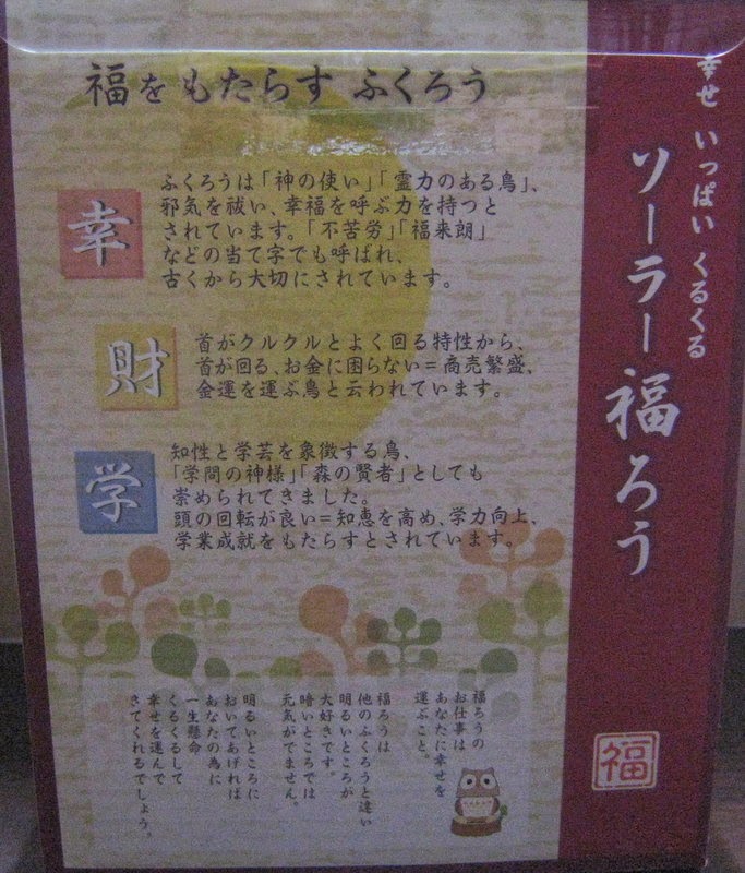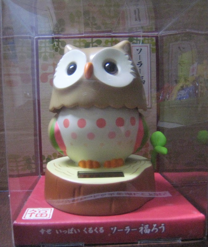 ・ソーラー福ろうEK-03B(薄茶) ・原産地:中国・サイズ:本体サイズ: W100×D105×H125mm・重さ:約125g・カラー:茶色&薄茶色・素材:本体:ABS・PS透明カバー:アクリルソーラーパワーでかわいく首を左右に振るよ!太陽の光で、ゆらゆら動きます。電池不要。新品車に乗せたらいい感じで動いてくれました。 商品価格:各2000円