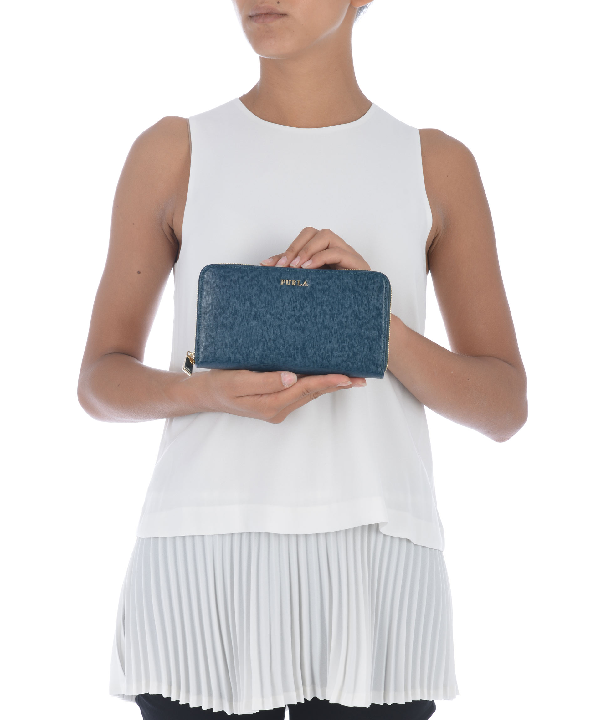 Portafogli Furla in pelle stampa saffiano Verde scuro. Apertura con zip dorata. All'interno tasca centrale con zip, scomparti per banconote, tasche per carte di credito. Logo frontale in metallo dorato.