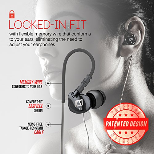 Designed to fit in the ear securely and comfortably, the Sport-Fi M6 eliminates the need to adjust your earphones in the middle of your routine. This is achieved with a patented ergonomic housing design, over-the-ear fit, and memory wire technology. The memory wire is flexible and conforms comfortably to the shape of your ears, providing a locked-in fit.