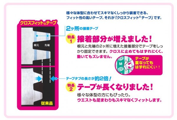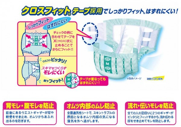 | クロスフィット(R)テープ採用でしっかりフィット、はずれにくい!前後にあるウエストギャザーが尿や軟便をせき止め、オムツからあふれ出るのを防ぎます。 |