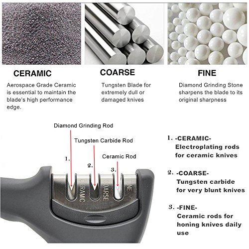 ★THREE STAGE SHARPENING SYSTEM - PREP SLOT realigns knife blade in readiness for sharpening.SHARPEN SLOT adds a fine deg to the knife blade.FINISH SLOT poishes the edge of knife for a super sharp finish.