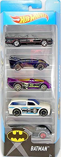 -. Binding : Toy -. Brand : Hot Wheels -. EAN : 0074299018060 -. Feature : Includes 5 1:64 scaled die-cast vehicles. / Set includes: Batman Classic TV Series Batmobile, Batman Live Batmobile (Dark Blue body), Power Pistons The Joker (Purple and green underside), Boom Box Gotham City Police Department (white), and Arkham Asylum Batmobile (black body and gray underside). / Vehicles listed from top to bottom in packaging. -. IsAdultProduct : 0 -. Label : Hot Wheels -. Manufacturer : Hot Wheels -. MPN : 001806AB -. PackageQuantity : 1 -. PartNumber : 001806AB -. ProductGroup : Toy -. ProductTypeName : TOYS_AND_GAMES -. Publisher : Hot Wheels -. Studio : Hot Wheels -. Title : Hot Wheels 2017 Batman 5-Pack