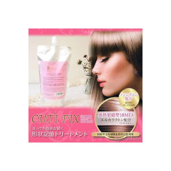 商品コード 44080103[商品名]キューティーフィックス 500ml 詰替え【キューティフィックス/CUTI FIX/髪 美容液/形状記憶/トリートメント/ヘアパック/ノンシリコン/詰め替え レフィル リフィル】[商品説明]新感覚!髪の美容液。洗っても効果が続く形状記憶トリートメント「キューティフィックス」は、スタインリングと集中補修が1本でできます。ドライヤーやヘアアイロンの熱で、傷んだキューティクルを感熱架橋型18MEA(エルカラクトン)が補修。バサバサの髪、まとまらないクセ毛がサラッとツヤのある髪に![使用方法]・シャンプー後、タオルドライした髪にスプレーし、ドライヤーでブローしてください。・その後ヘアアイロンでスタイリングして頂きますと、更に効果的です。・シャンプー後、髪の水分をよくきり毛先やダメージ部を中心にスプレーし、クシで全体になじませて2-3分おいてください。その後、軽く流してください。・キューティFIXをスプレー後、いつもお使いのコンディショナーをお使いいただいても効果的です。キューティーフィックス150mlもあります。商品コード 44080103