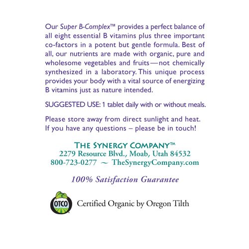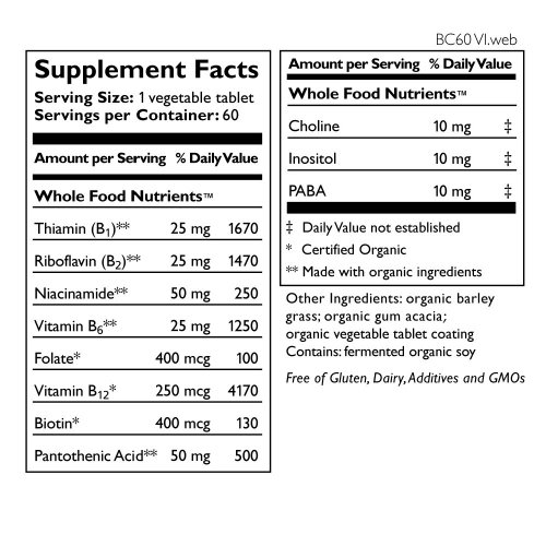 -. Feature : Nature's stress relievers and revitalizers / All 8 B vitamins plus choline, inositol, PABA--grown as whole food, not made in a lab / Supports and balances your energy, metabolism, mood and nervous system / Free of fillers, flavorings, binders, and other chemical additives / Made with Organic Ingredients, Gluten-Free, Dairy-Free, Chemical-Free, Non-GMO