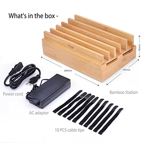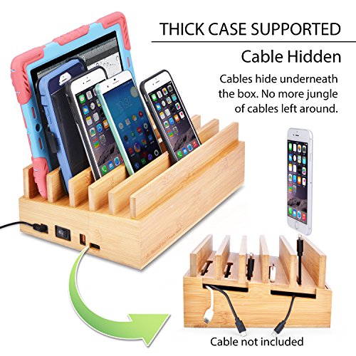 CLUTTER REDUCING DESIGN - Special bamboo case makes for a unique decoration at home, office, organization etc. You can manage all of the charging cables with the provided cable ties and hide them underneath the box; resulting in a neat and stylish charging centre! It also supports devices with thick cases, such as Otterbox.