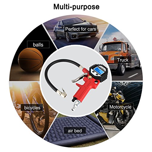 - ✔ 3 IN 1 MULTI-PURPOSE : It's not only a tire pressure gauge, but also can be as pressure releaser by simply press on the quick release button if needed, as well as an inflator by using with air pump (not included), perfect for most tires of vehicles, motorcycles, bikes, sport balls, balloons, inflatable toys, etc.