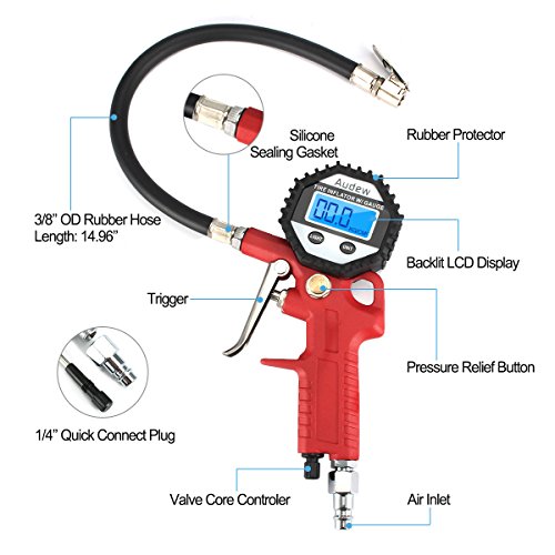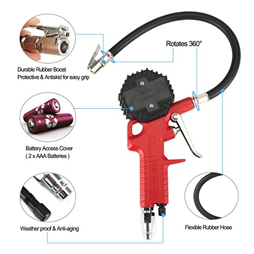 - ✔ EASY TO USE : AUDEW portable tire gauge with 360° chuck helps access all valve positions. Comes with High quality flexible rubber hose and unique lock-on air chuck, the thickened-designed pure alloy socket-style gas interface and 90 degree valve extender perfectly work for different kinds of stem clamps.