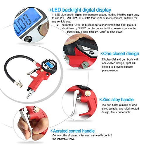 - ✔ ACCURATE MEASUREMENT : AUDEW digital tire gauge has 4 changeable measurement units: 0-150PSI, 0-10BAR, 0-1000KPA, 0-10KG/CM2; High Measuring Accuracy: ±1% (Relative Humidity Temperature 25°C). Excellent Accuracy and Superior Readability in any situation, helping you to monitor your tire condition at all times.