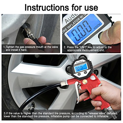 - ✔ EASY READING : AUDEW tire pressure gauge equipped with LCD blue backlight digital display, intuitively and clearly shows you the readings both at day and night, which is far beyond those inconvenient dial gauge that may cause incorrect readings due to visual deviation.