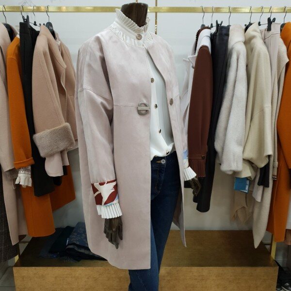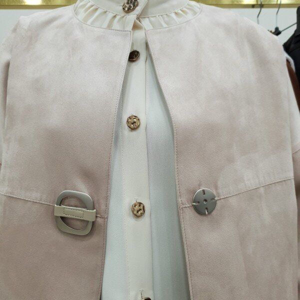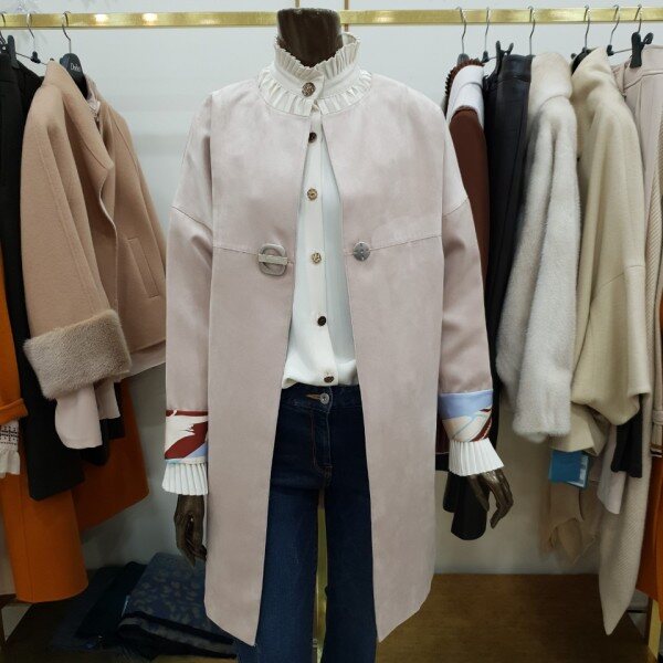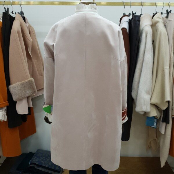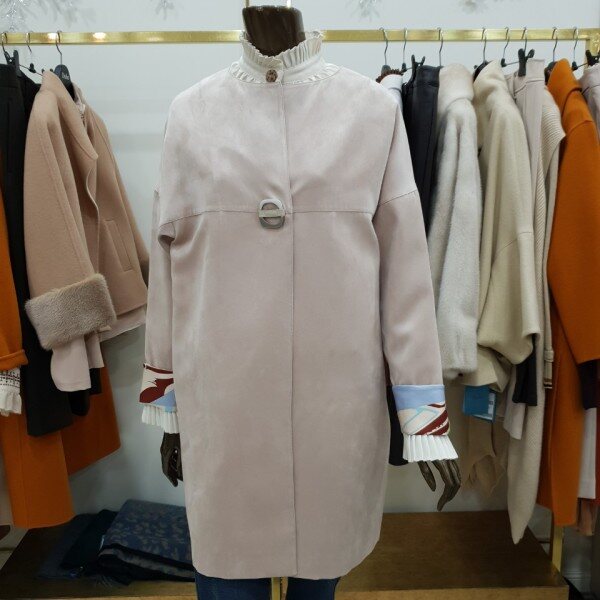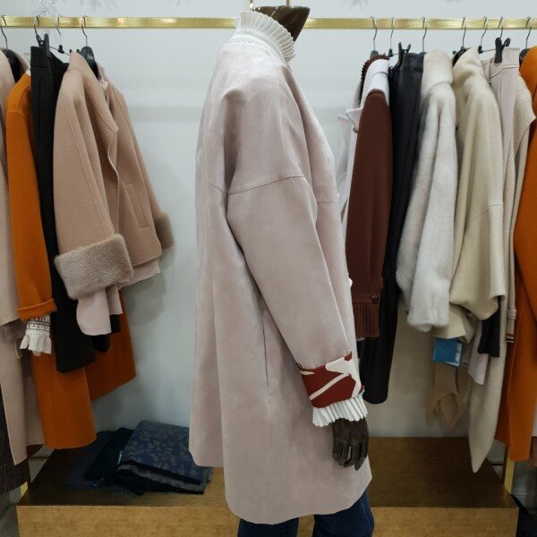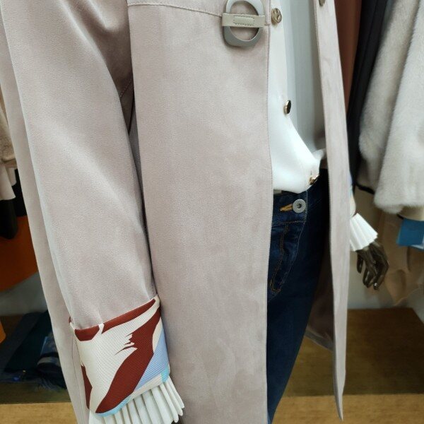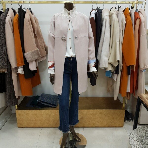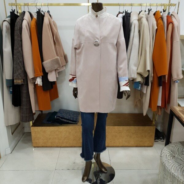 독특한 형태의 스냅 장식과 믹스매치 된 실크 배색이 조화를 이루는 하프 코트 입니다
