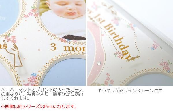 | 生まれてから毎月1枚ずつ写真を収めて完成させる、12ヶ月フォトフレーム。キラキラ光るラインストーンが付いたペーパーマットとプリントの入ったガラスの重なりが、中に入れる写真をよりいっそう華やかに見せてくれます。 |