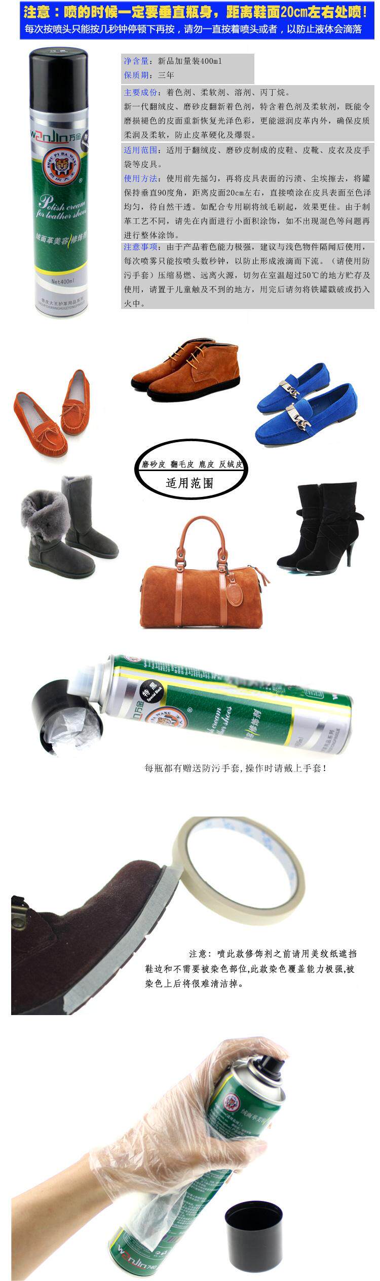 Method of use: shake well before use? and then wipe theleather surface stains? dirt? can maintain the vertical angle of 90 degrees? from the surface about 20cm? direct sprayuniform color in the leather surface to be dry. As with the special brush brush? a better effect. The tanning process?please? small area of surface finishing? such as no color mixing? and then the overall finishing.