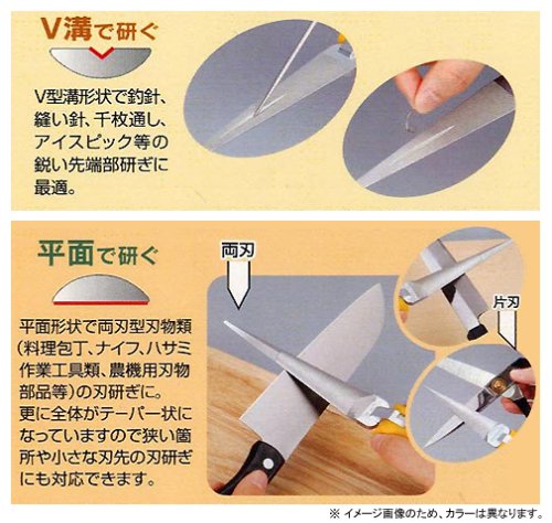 ● As a design feature, polishing work such as needle-like ice picks, awls, skewers, sewing needles, etc. which had been difficult to polish by conventional V grooves became easier, and the polishing work of the tools in the home