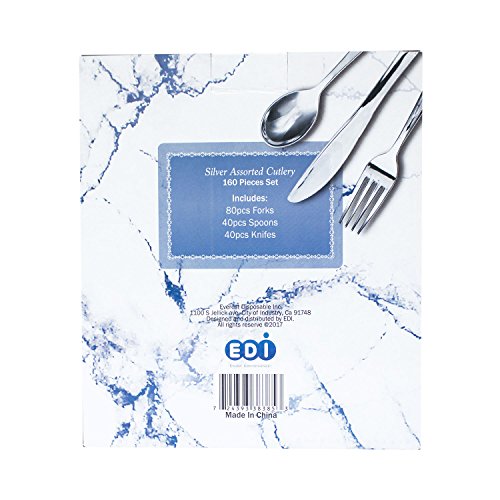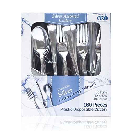 Product DescriptionEDI White Disposable Plastic Cutlery Set,80 Forks,40 Knives,40 SpoonsEDI Plastic Cutlery Combo Box, Silver, 160 Count. Designed for all occasions, banquets, parties, upscale catering and home. Disposable Washable and reusable. Comes in a paper box.0