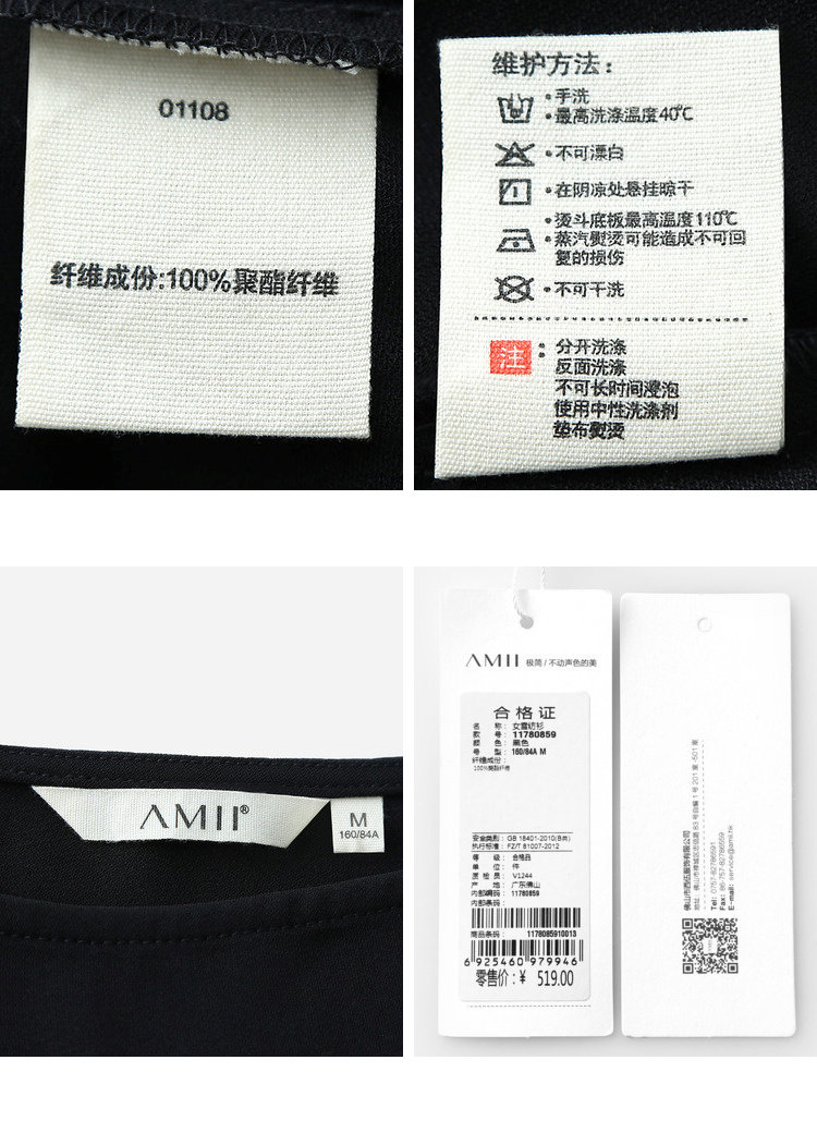洗涤标准:不可浸泡不可漂白110℃以下垫布熨烫悬挂晾干遮阴晾干40℃以下手洗不可干洗