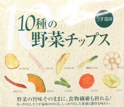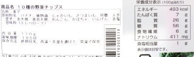 原材料:バナナ、植物油、じゃがいも、さつまいも、砂糖、人参、里芋、赤大根、青首大根、れんこん、かぼちゃ、いんげん、食塩、甘味料(トレハロース)