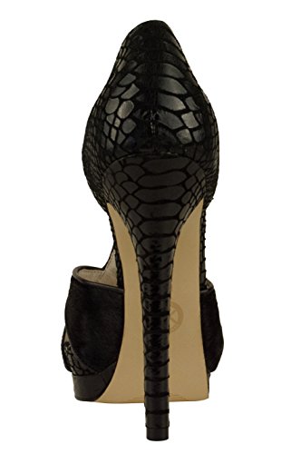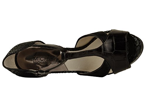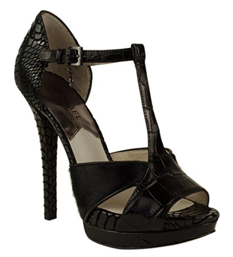 Embossed leather upper Peep toe, T-Strap?construction Adjustable buckle ankle closure for easy on/off, with MK logo charm Leather/Synthetic lining Lightly cushioned footbed Approximately 5" heel height Leather/synthetic?outsole 0