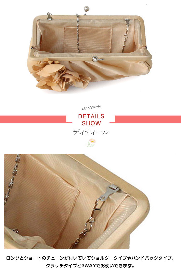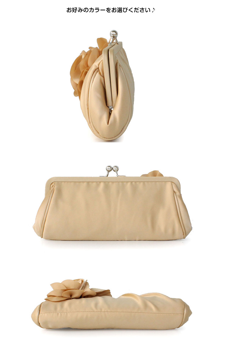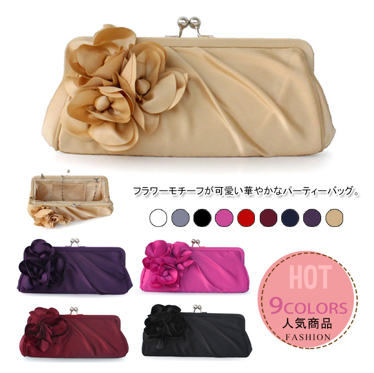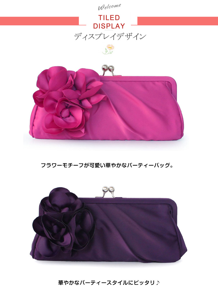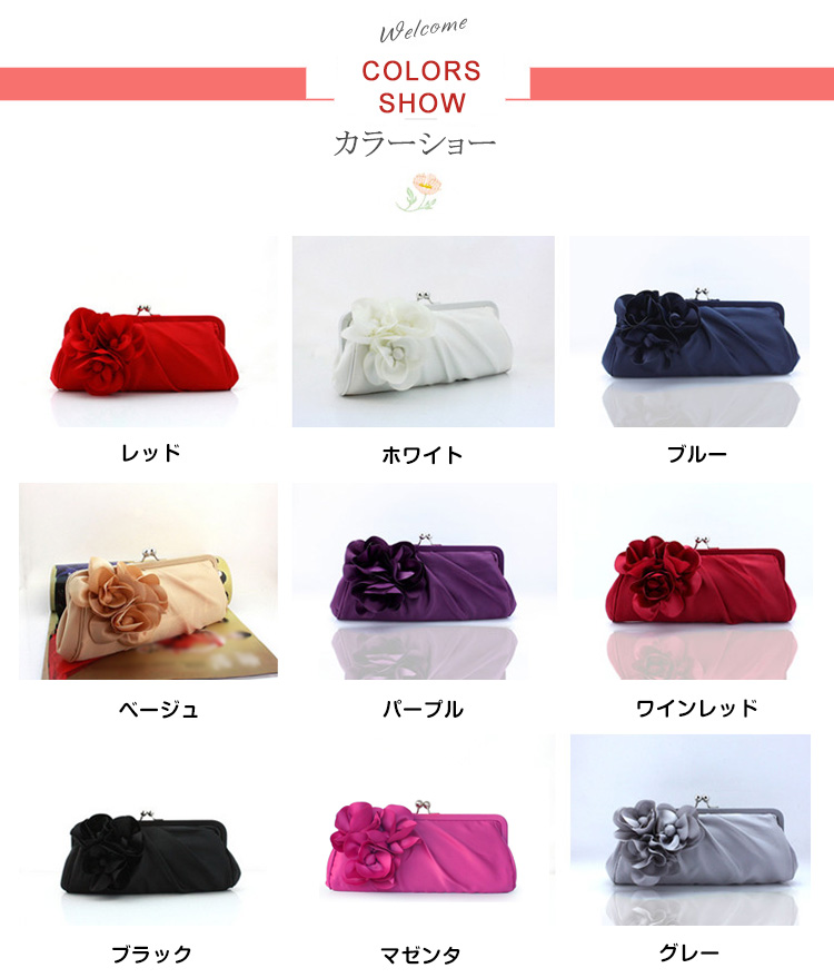 | フラワーモチーフが可愛い華やかなパーティーバッグ。華やかなパーティースタイルにピッタリ♪サテン生地の光沢感が上品さも醸し出します。結婚式や披露宴、2次会にはもちろんお食事会や謝恩会など活躍の場がたくさん◎お好みのカラーをお選びください♪ | |