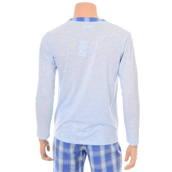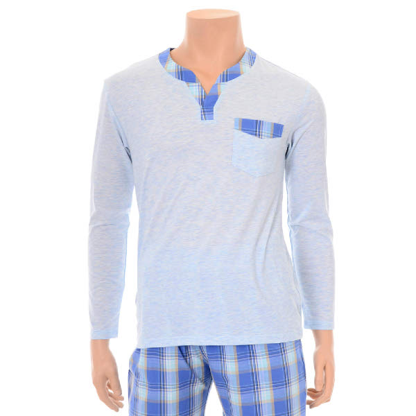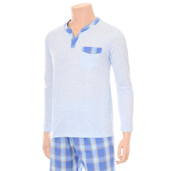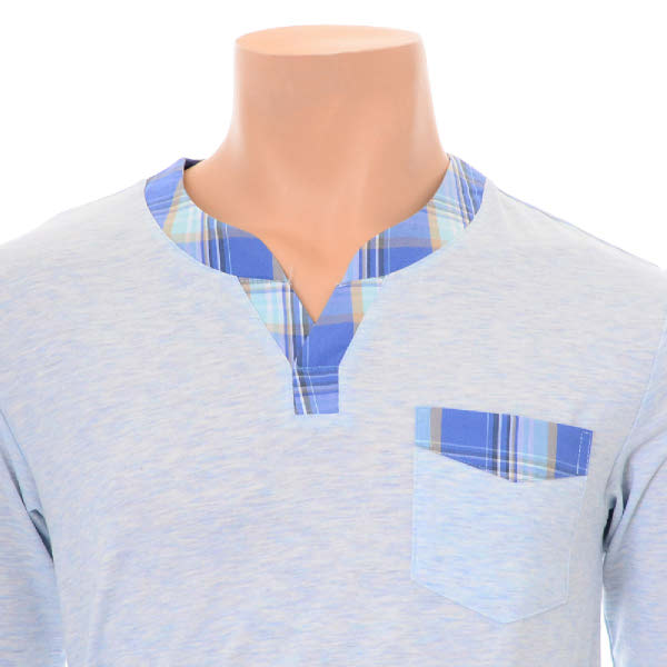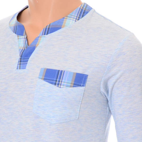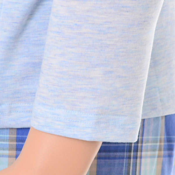 상의는 폴리와 레이온이 혼방되어 스트레치가 있는 솔리드 컬러의 멜란지 소재로 제안되며, 체크 원단이 포인트로 사용한 제품입니다.