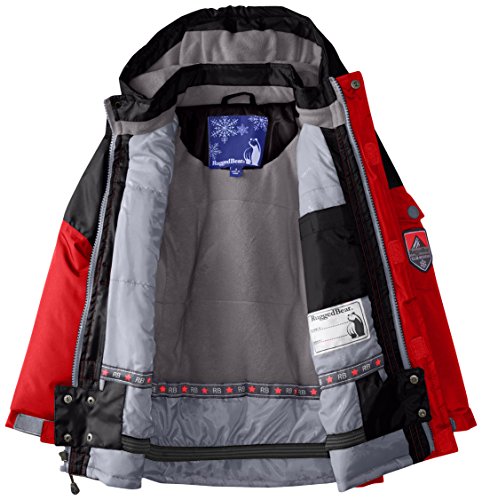 Color-blocked cold-weather jacket featuring polar fleece lining, snap-close storm gator closure at inside waist, and hood with hook-and-loop face shield Zip-front closure with covered placket Side entry hand pockets and snap-flap patch pockets at chest and sleeve Polyester fill Brand : Rugged Bear EAN : 0887310373211 Product Dimensions(LxWxH) :