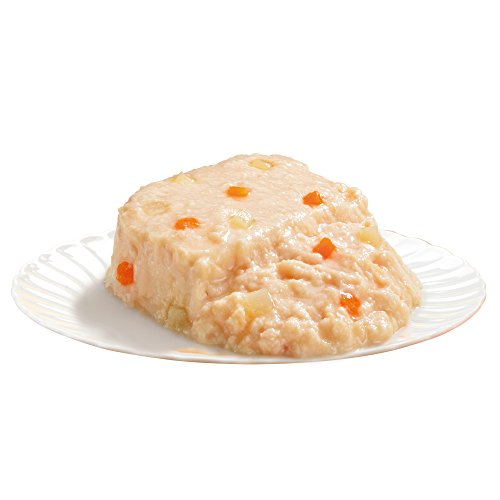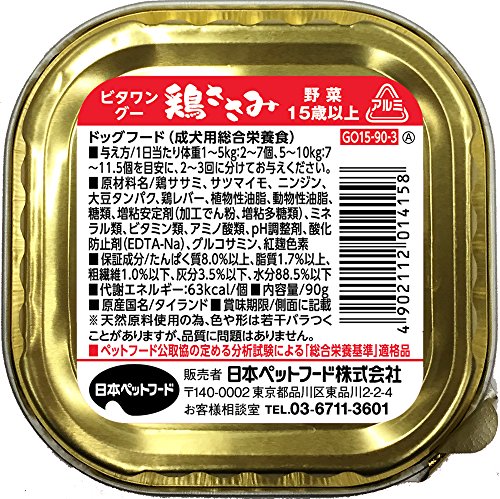 原材料:肉類(鶏ササミ、チキンレバー)、ニンジン、ポテト、サツマイモ、コーンスターチ、植物性油脂、トマトペースト、増粘多糖類、ミネラル類、調味料、乳化剤、酸化防止剤(EDTA-Na)、ビタミン類、紅麹色素、グルコサミン