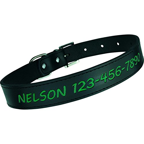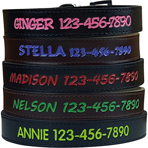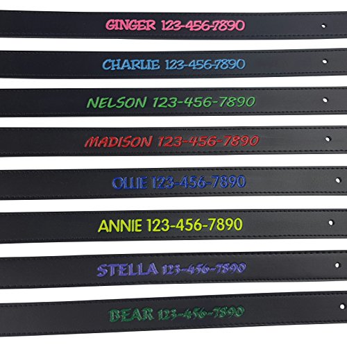 * Wandering dogs always find their way home with their name and phone number safely engraved and painted on their collar * Handpainted and engraved in our Vermont shop with durable, permanent, gloss color * Your choice of 8 durable text colors - Green, Light Green, Blue, Light Blue, Red, Pink, Yellow, Purple * 3 sizes fitmost small to large breeds with necks between 11.5 inches and 22 inches