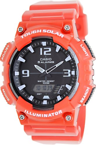 Brand, Seller, or Collection Name:Casio Model number:AQS810WC-4AV Part Number:AQ-S810WC-4A Item Shape:Round Dial window material type:Mineral Display Type:Analog and digital Clasp:Buckle Case material:Plastic Case diameter:45 millimeters Case Thickness:12 millimeters Band Material:Plastic Band length:Men's Standard Band width:20 millimeters Band Color:Red Dial color:Black Calendar:Yes Special features:Stop watch, Timer, Luminous Item weight:4.16 Ounces Movement:Quartz Water resistant depth:100 Meters