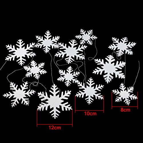 - Size: Total length of 19.7 Feet/236.2 Inches and consists of tridimensional christmas paper snowflake in size of 4.7 inches, 3.9 inches, 3.1 inches with white