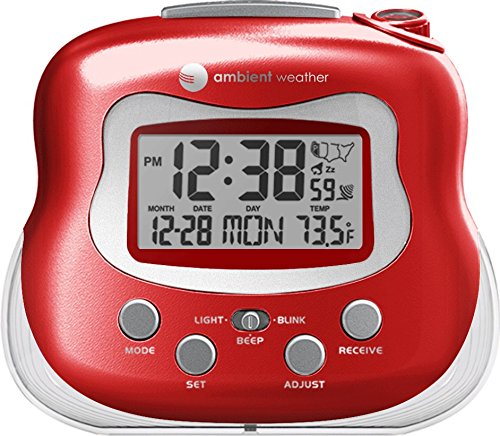 Studio : Ambient Weather Publisher : Ambient Weather Binding : Kitchen Product Description Features: Projection (time indoor temperature) Radio Controlled Clock never needs updating for Daylight Savings Time Indoor temperature Choose to display temperature reading in Farenheit or Celsius Time date Alarm with Snooze LED Backlight Product Dimensions: 4" L x 2"D x 4.5"H Includes: RC-8370 Projection Clock AC Adapter User Manual Three AA batteries not included 0