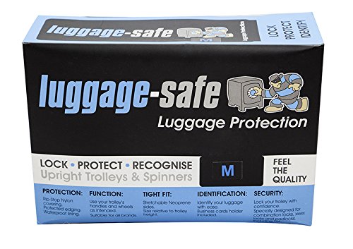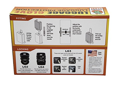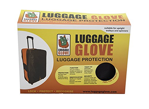Product Description LUGGAGEGLOVEUSA will provide additional protection for your suitcase and save you money by extending the life of your luggage. LUGGAGEGLOVEUSA has been designed to minimize the chances of: baggage theft, damage to your bag during transportation, security personal destroying your locks and delays in identifying your bags. Our design will cover almost every type of upright case conforming to the size range shown above. The specially constructed Neoprene is designed to stretch around your suitcase and the adjustable locking strap will make sure that your LUGGAGEGLOVEUSA fits nice and snug. Height of Suitcase 25 - 27 inches: Medium 27 - 30 inches: Large T RAVEL SENTRY® COMBINATION LOCK - a combination locking system that is recommended by the TSA. This lock has a unique tool-point that allows US customs personnel access to inspect your luggage. This is one of only two accepted locking systems when travelling to and within the USA. The Travel Sentry ® license is strictly controlled - only approved factories are allowed to manufacture and only approved wholesalers are allowed to distribute. Luggage Safe and Luggage Glove are a registered Travel Sentry wholesaler and able to offer this TSA-approved lock. Travel Sentry creates and manages standards that improve travel security in cooperation with government security agencies, airlines, airports and the travel goods industry. Recognized and Accepted Travel Sentry® Approved locks are officially recognized and accepted by the US Department of Homeland Security's Transportation Security Administration (TSA) and by Her Majesty's Revenue and Customs (HMRC) in the U.K. How it Works The Travel Sentry luggage security system is in use at hundreds of airports around the world. The system has been implemented at every U.S. airport including overseas territories such as the U.S. Virgin Islands, American Samoa, Guam, and Micronesia. LUGGAGEGLOVEUSA Your complete luggage protection system. LOCK - PROTECT - RECOGNIZE 0