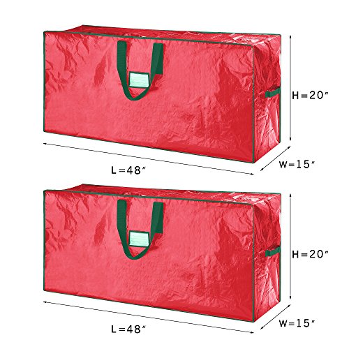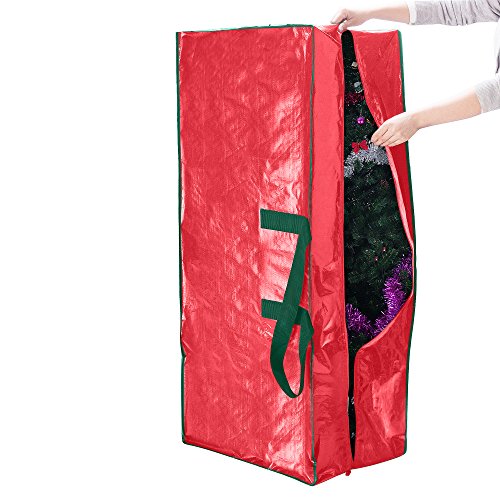 Studio : Elf Stor Publisher : Elf Stor Binding : Kitchen Product Description Clean up after the holidays are a snap with the Large Elf Stor Christmas Tree Storage Bags in a Pack of Two. Have more than one Christmas tree or the largest tree in the neighborhood? A set of 2 Elf Stor Christmas tree bags will store your tree(s) away neatly, effortlessly, and make for quick set-up next year. It's as easy as placing your artificial Christmas tree in the bag, zip it up and safely store it away until next year. Because our bags are a full 48 inches long, 15 inches wide, and 20 inches deep, you will have no problem storing unassembled artificial trees of any size. The Elf Stor Christmas Tree Storage Bags come in red and has sturdy vinyl carry handles. No assembly required, just unpack, unfold, and insert your tree. Specifications: Each Bag Measures 48" X 15" x 20" (LxWxH), Made of high impact tear-proof polypropylene, Sturdy Carry Handle for transporting your tree, One bag holds up to a 7.5' tall Christmas tree, Moisture resistant, keeps out dust and pests, Folds flat when not in use Heavy Duty Full Length Zipper, Designed to protect your tree from damage, dust and moisture, Full 1 Year Warranty. 0