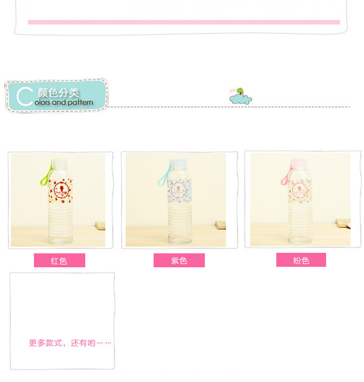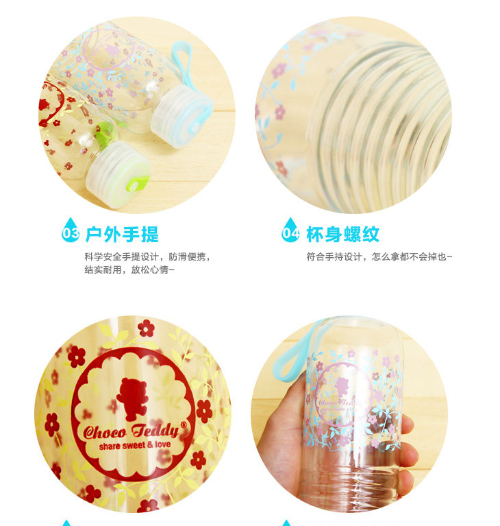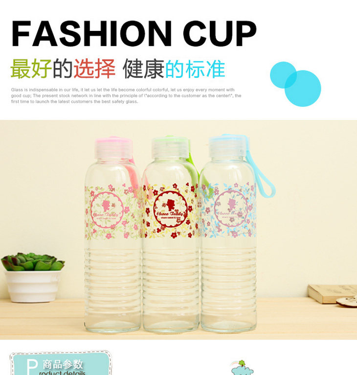 | Product Description | Floral Bear portable glass 550ml, food-safety grade green high transparent new materials, safe and reliable, impact, temperature and other characteristics. Embedded lid sealing gasket good elasticity, no trace of repression polished bottle rounded nature, exquisite thread design, delicate lines, fresh and bright, give you lots of water fun. Cup has superior sealing performance, special production process bottom of the cup bottom of the cup to create a three-dimensional lines, can effectively enhance the bottom of the cup of friction. Bottom of the cup high-quality materials, durable wear, manufacturers factory certification, use more confidence. Whenever the time to go out, bring your own cups, drinking more convenient, more environmentally friendly, less to buy a bottle of mineral water, to make more of a contribution to our environment. |