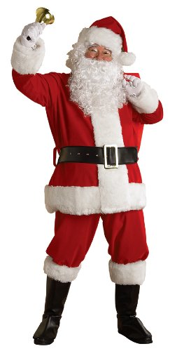 - Feature : Regal plush Santa suit in classic Christmas red trimmed with rich faux fur / Jacket with hidden zipper front, elastic waist pants with pockets, hat, vinyl belt with metal buckle, boot-tops, beard, and wig all included / Stuffable belly, Santa glasses, bell, sack, and gloves all available separately from Rubie's / Review Rubie's size chart before making a buying decision, Santa suits do run large / Rubie's Costume offers Santa beards, wigs, and costumes for every budget - from value to deluxe / Regal Plush Santa Suit features a lined red jacket with a front zipper closure and rich faux fur trim, pants with pockets to keep candy canes handy, and a matching hat / Black vinyl belt with a metal buckle and vinyl boot tops, designed to be worn over your own black shoes, are included / Santa wig and beard are included to complete the look, gloves, sack, and glasses sold separately / XXL fits up to jacket size 60, dry clean jacket and pants / With this quality costume, you can make a visit from Santa an annual tradition