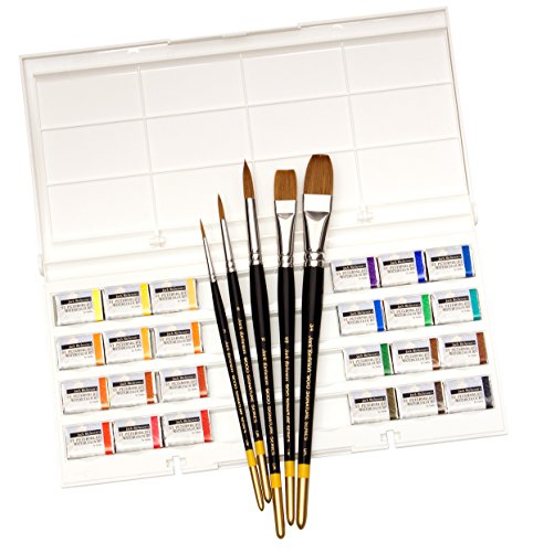 Barb Seibel's plein air watercolor kit is the perfect combination of 9000 series Jack Richeson professional synthetic watercolor brushes and the St. Petersburg professional watercolor set of 24. The 9000 series brushes contain seven different types of pointed synthetic fibers blended to create a marvelous artist tool. The St. Petersburg original watercolor set contains liquid poured, semi moist, full pan watercolors that are manufactured in a St. Petersburg factory that has been producing color for over 100 yearsFeature