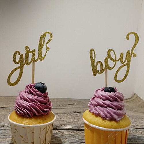 Set of 24 Gender Reveal Cupcake Toppers Gold Glitter Boy or Girl Party Decors - by Giuffi