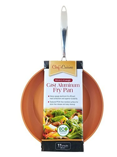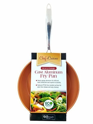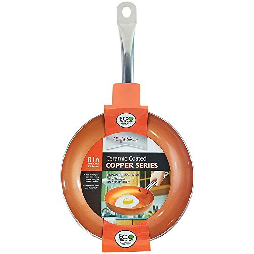 Make flawless omelets and evenly cooked steaks with this copper pan. All your foods will slide right out. Say goodbye to cooking sprays and reserve your butter just for your toast, now with the pan you don't need to grease. This fry pan is PFOA and PTFE free so it is safe to use in your home and cook your meals for your family and friends. It is created without chemicals toxic to the environment as well, so you can cook without any guilt. Sear your pork chops and then pop them into the oven without worry. This pan is designed to withstand temperatures up to 500 degrees Fahrenheit, making is reliable for any and all kinds of cooking. Because nothing sticks to the pan, it comes clean easily. It is dishwasher safe as well so you can just pop it in and turn it on. In no time your pan is sparkling clean and ready to use again, and you'll be wanting to use it as much as you can. Package contains (1) Chef's Cuisine Copper Non Stick Fry Pan, 8 Inch. Professional grade heavy gauge cast aluminum. Stainless steel handle. Capable up to 500 degrees Fahrenheit. PFOA and PTFE free. Dishwasher safe.Feature