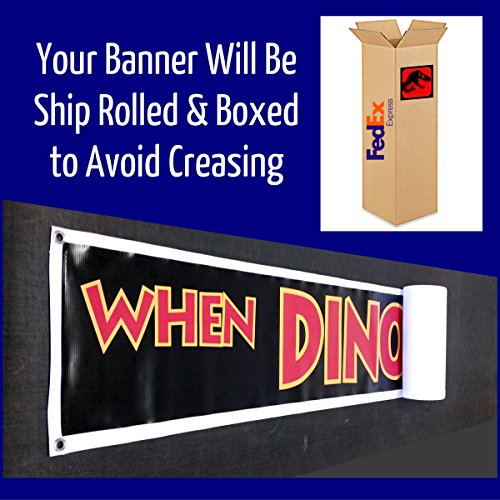 TODAYS SPECIAL DEAL!!! TURN HEADS with AMERICA'S #1 RATED: Extr a Large Jurassic Park "WHEN DINOSAURS RULED THE EARTH" banner sign captured from the ORIGINAL JURASSIC PARK MOVIE, Digitally printed with outdoor durable UV inks. All Jurassic Park / World Banners are Hemmed and Grommeted for easy hanging.