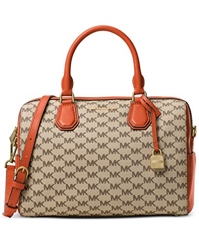 -. Brand : Michael Kors -. Color : Natural/Orange -. Department : womens -. EAN : 0190049627150 -. Feature : 11-1/2"W x 8-1/4"H x 6-3/4"D / Interior features 1 zip pocket, 4 slip pockets and 1 key finder / 4-3/4"L double handles; 20"L-22-1/2"L detachable strap / Zip closure / Exterior features logo, hanging lock charm and 2 side magnetic-snap pockets -. PackageQuantity : 1 -. ProductGroup : Shoes -. ProductTypeName : HANDBAG -. Title : MICHAEL Michael Kors Signature Mercer Medium Duffle Bag Natural/Orange -. UPC : 190049627150