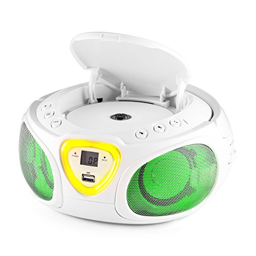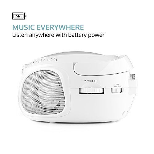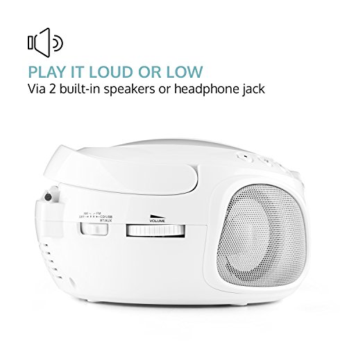 Compact boombox with top-side CD player, USB MP3 player, AM / FM radio and Bluetooth connectivity.