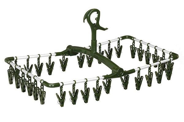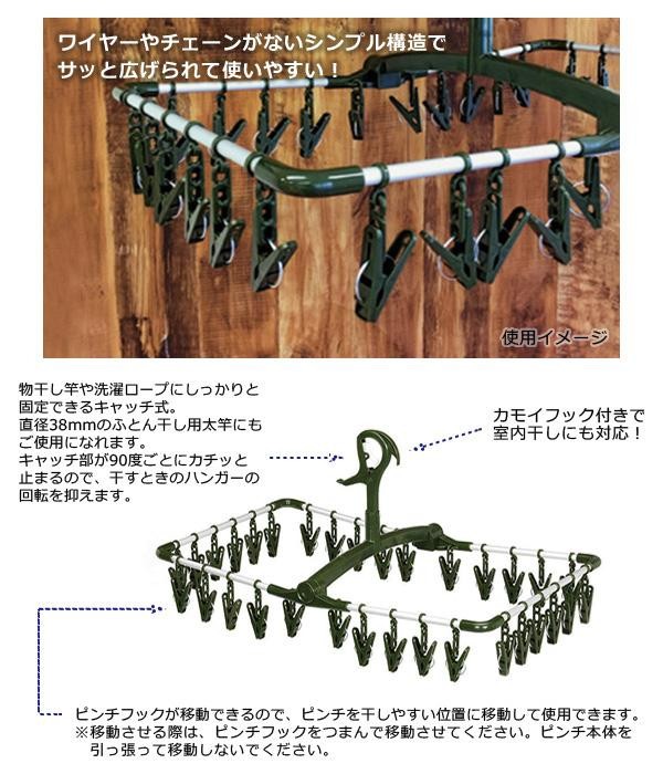 ピンチフックが移動できるので、ピンチを干しやすい位置に移動して使用することができます。吊りチェーンのない上折れタイプで、サッと広げられて使いやすい!ピンチは洗濯物にはさんだあとが残りにくい細かな凸面構造です。傷んだら、お手持ちのピンチと取り替えることができます。 |