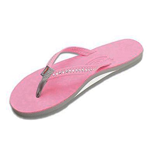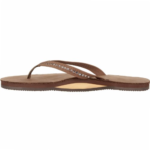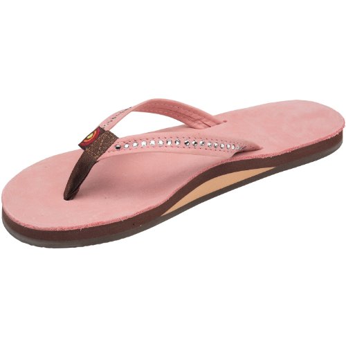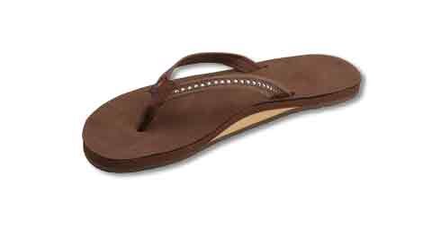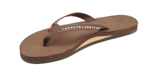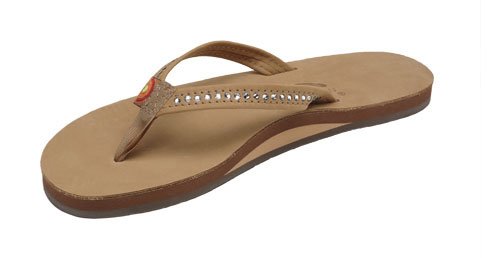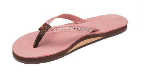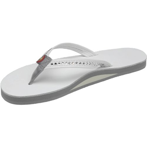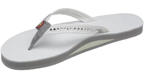 The Crystal Collection is modeled after our popular single layer leather sandal, but the narrow strap being embedded with Swarovski Crystals. They are featured in Wedding White - here comes the bride! This sandal is our popular single layer leather with arch support; it has a premier leather top sole and narrow strap; which is embedded with genuine Swarovski Crystals. You get the same great structure using bonded nylon thread on the nylon toe piece, and box X stitch. The layers are triple glued and it sits on a non-slip Rainbow bottom. The Rainbow logo is embossed on the leather top sole and we finish it off with the Original Rainbow woven label on the right strap. Dress up any outfit with the Crystal Collection.