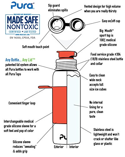 Our development team took up the challenge of creating the first (and only) 100% plastic-free sport bottles in the world. By combining two safe and proven materials, Food Grade Stainless Steel and Medical Grade Silicone, we created the Pura SportTM collection of water bottles. Each bottle features our patented, medical grade silicone Big MouthTM sport top. The Big Mouth allows a free flow of liquids when open and is leak proof when closed. Available in 18oz, 28oz and 22oz Insulated sizes. As with all bottles in the Pura offering, our 28oz Sport bottle is 100% plastic-free and can be used with any of our silicone lids including our nipples, spouts, straws, and flat lids. With Pura you can rest assured that you are always using the safest and most eco-progressive bottle on the market. One Life... One BottleTMFeature