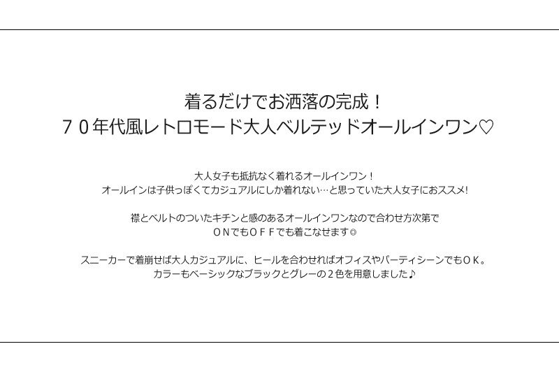 | 商品説明 | 大人女子も抵抗なく着れるオールインワン! オールインは子供っぽくてカジュアルにしか着れない…と思っていた大人女子におススメ! 襟とベルトのついたキチンと感のあるオールインワンなので合わせ方次第で ONでもOFFでも着こなせます◎ スニーカーで着崩せば大人カジュアルに、ヒールを合わせればオフィスやパーティシーンでもOK。 カラーもベーシックなブラックとグレーの2色を用意しました♪ |
