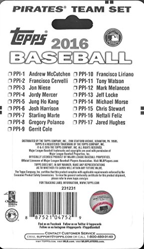 [Product Information]- This is a 2016 Topps Pittsburgh Pirates Factory sealed special edition 17 card team set; cards are numbered PPI-1 through PPI-17 and are not available in packs. Players included are Andrew McCutchen, Francisco Cervelli, Jon Niese, Jordy Mercer, Jung Ho Kang, Josh Harrison, Starling Marte, Gregory Polanco, Gerrit Cole, Francisco Liriano, Tony Watson, Mark Melancon, Jeff Locke, Michael Morse, Chris Stewart, Neftali Feliz and Jaren Hughes.