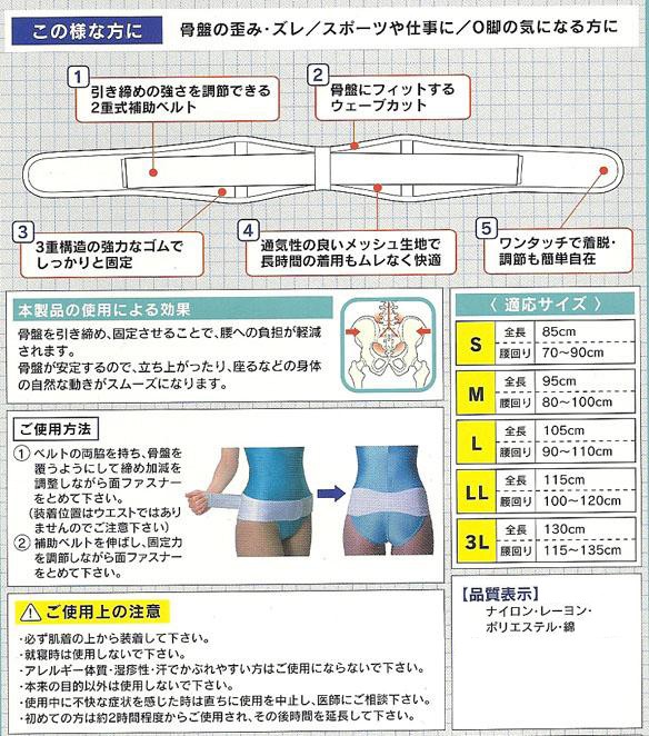 | 骨盤をしっかりと固定する3種構造のゴムがしっかりと骨盤をサポートします。従来の生ゴムタイプでは得られない固定力の調節機能を2重式補助ベルトで実現しました。骨盤にフィットするウェーブカットにより骨盤を固定したまま身体の動きにも対応できます。 |